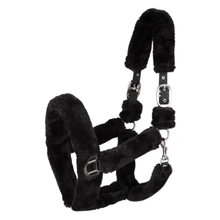 The Cozy Halter - Black is a premium belt-style halter fully covered with soft synthetic fur for enhanced comfort. The Cozy Halter - Black is designed to provide a gentle and protective fit for sensitive horses.