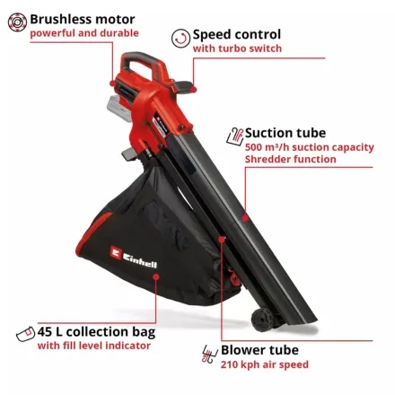 The Einhell 18V Cordless Leaf Vacuum delivers impressive performance with suction capacity of 500 m³/h and blowing air speed up to 210 km/h. The integrated shredding function reduces collected leaves to one-tenth of their original volume before depositing them into the large 45-litre quality collection bag with viewing window. Tool-free changeover between blower and suction functions ensures maximum versatility.