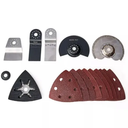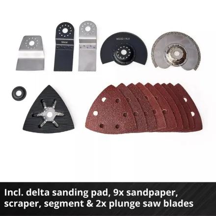 As a member of the Power X-Change family, the Einhell 18V Professional Cordless Multifunctional Tool (Body only) is compatible with all Power X-Change batteries and chargers. Features include speed electronics for material-appropriate work, LED light for optimal illumination, switch with locking function for time-consuming tasks, and ergonomic Softgrip handle. Comprehensive accessories include delta sanding shoe, multiple saw blades, scraper, and 9 sandpapers.