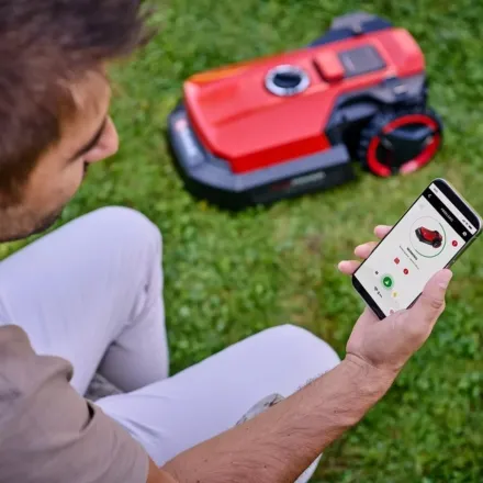 The Einhell 18V Robot Lawn Mower 18cm with 2.5Ah Battery offers exceptional smart control via the Einhell Connect app over Bluetooth or Wi-Fi, allowing you to adjust settings from anywhere through your home network connection. Over-the-Air updates are automatically installed via Wi-Fi without requiring a USB stick. Advanced features include programmable mowing times (down to the minute), multi-area mowing for complex gardens, second-area program for separated sections, and spot-mowing for targeted areas.