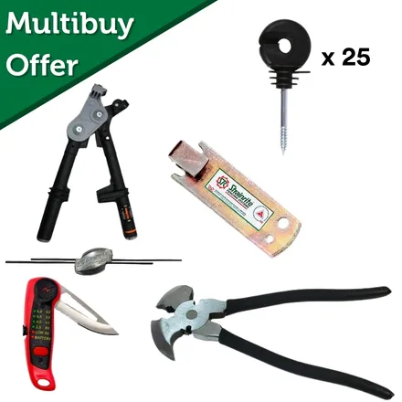 Features of the Fencing Bundle (Gripple Starter Pack, Wire Twister, Pliers, Boundary Blade, Insulators)