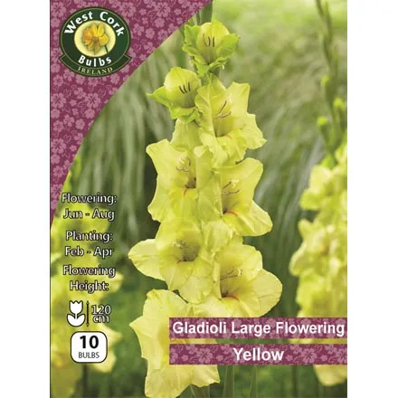Our Gladioli Large Flowering Yellow have been chosen for their brightly coloured flowers which can reach 100cm, prolonged growing time and value for money. With their dark foliage and tall flowers Gladioli Large Flowering makes a stunning addition to your garden or patio containers and make beautiful cut flowers to brighten up your home. To enjoy your blooms for an extended season, plant bulbs at two-week intervals from early spring until the end of June. Gladioli Large Flowering are easy to grow and are perfect for beginners or seasoned gardeners alike requiring only full sun and good drainage, Our Gladioli Larger Flowering bloom from June to October and comes in a verity of colours in packs of 10.