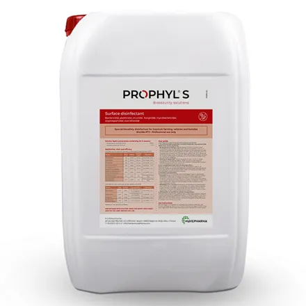 Dilute Prophyl® S in water at 1–2% (1:100 to 1:50) depending on the desired protection. Apply 200–300 ml per m² using a low-pressure sprayer to walls, floors, ceilings, and equipment, ensuring near-runoff coverage. Leave to act for 30–60 minutes depending on the target pathogen. Increase contact time in cooler temperatures.