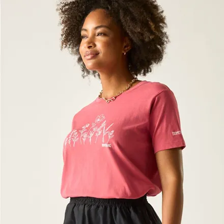 The Regatta Women's Filandra VX T-Shirt Rose Floral Meadow combines style with comfort in this versatile cotton jersey top. Featuring a classic crew neck design and eye-catching graphic print with mixed applications, this T-shirt is crafted from 160gsm BCI cotton blend fabric, ensuring both durability and breathability for everyday wear.