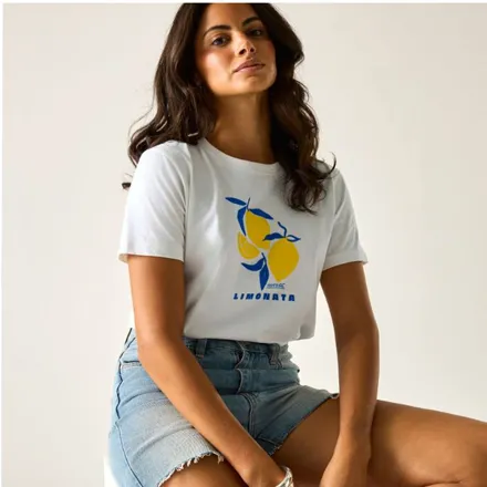 The Regatta Women's Filandra VX T-Shirt White Limonata combines style with comfort in this versatile cotton jersey top. Featuring a classic crew neck design and eye-catching graphic print, this T-shirt is crafted from 160gsm BCI cotton blend fabric, ensuring both durability and breathability for everyday wear.